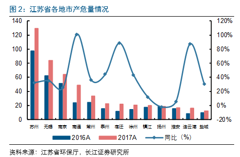 受環(huán)保督察等監(jiān)管趨嚴的影響,2017年江蘇省危廢產(chǎn)量約509萬噸,同比增37%,蘇州、無錫合計占比42%,可獲得數(shù)據(jù)的13個地市除了揚州產(chǎn)危來量略降2%,剩下地市產(chǎn)危量都出現(xiàn)不同程度的增加,其中南通(101%)、宿遷(89%)、連云港(88%)、泰州(44%)增速靠前。