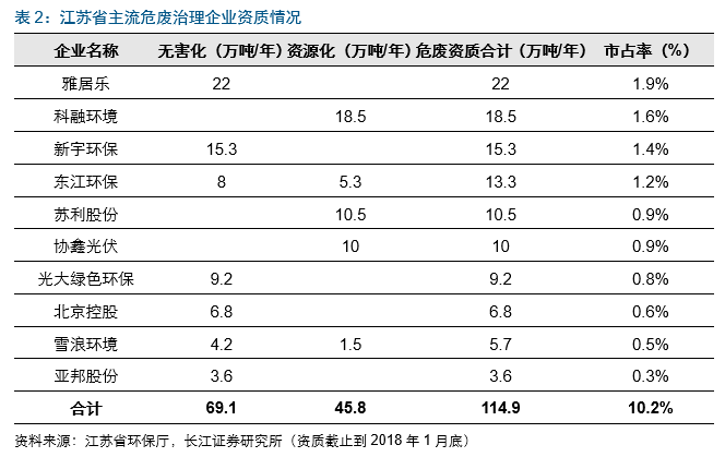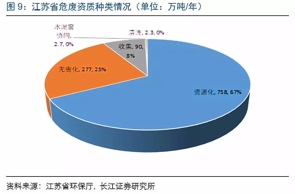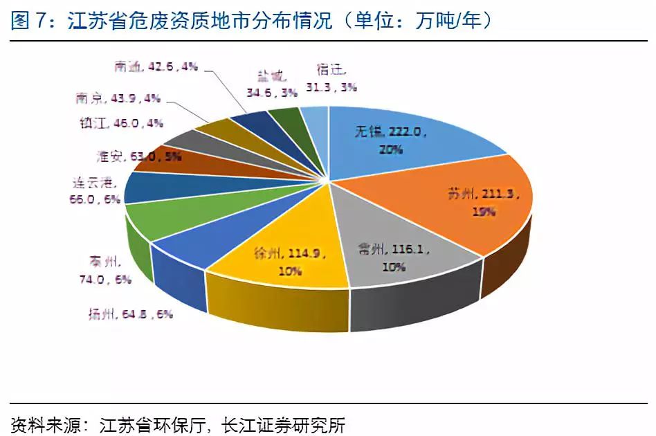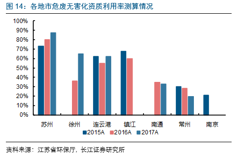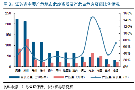 徐州(18%)/連云港(25%)/淮安(27%)/揚州(29%)/常州(29%)占比較低,危廢資質供給量相對充裕;
