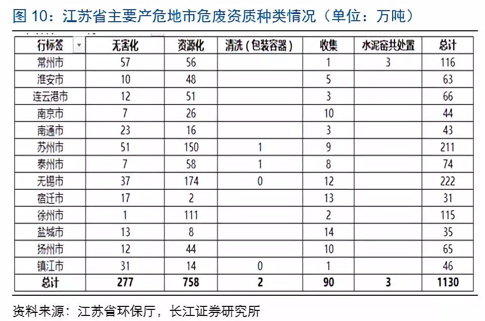 無害化資質相對稀缺,其中,徐州、泰州、南京、淮安無害化資質沒超過10萬噸,資質相對緊缺。