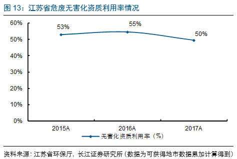 根據(jù)部分樣本我們統(tǒng)計得出2015-2017年江蘇省無害化危廢資質利用率分別為53%、55%、50%。從樣本來看,蘇州無害化(焚燒+填埋)資質利用率一直很高,保持在70%以上,2017年達到87%。