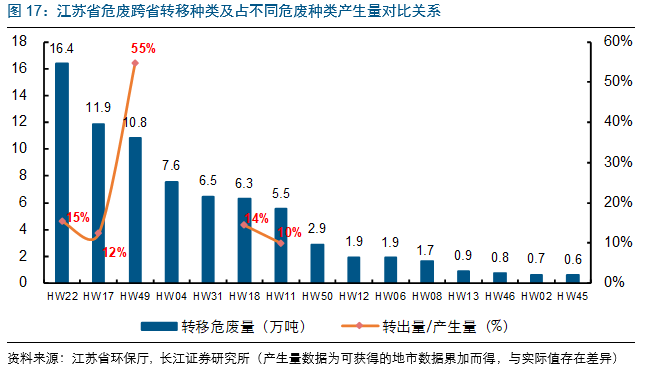 從2017年轉出危廢種類來看,含銅廢物(HW22)/表面處理廢物(HW17)/其他廢物(HW49)/農藥廢物(HW04)/含鉻廢物(HW31)前五合計達53.1萬噸,占轉出量的69%。而從轉出量和產(chǎn)生量的比例來看,江蘇省HW49(其他廢物)對省外處理資質依賴度高;剩下基本都在本省進行處理。