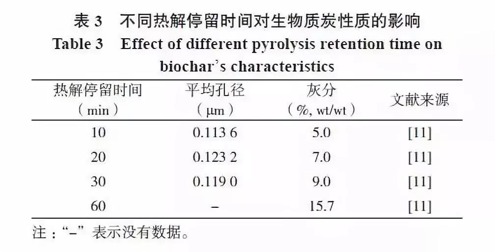生物質(zhì)炭具有復(fù)雜的孔隙結(jié)構(gòu),其孔徑大小決定其比表面積。而生物質(zhì)炭的孔徑大小與熱解停留時(shí)間也有關(guān)系。當(dāng)熱解停留時(shí)間為20~30 min 時(shí),生物質(zhì)炭的平均孔徑相對(duì)于停留時(shí)間10 min 時(shí)的孔徑尺寸提高了4.8%~8.5%(表3)?;曳趾恳矔?huì)隨著熱解停留時(shí)間的延長(zhǎng)而增加。Tan 等分析結(jié)果表明熱解停留時(shí)間為20 min,生物質(zhì)炭的灰分含量為7.0% ;停留時(shí)間為60 min,其灰分含量增加至15.7%。這是由于熱解停留時(shí)間長(zhǎng),易于有機(jī)物質(zhì)揮發(fā)而殘留更多的灰分。