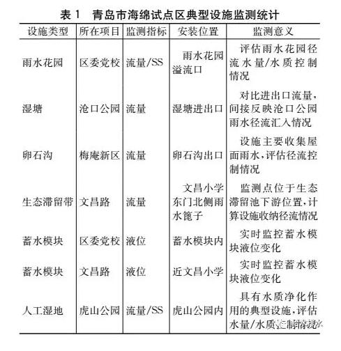 根據(jù)住建部出臺的《海綿城市建設典型設施設計參數(shù)與監(jiān)測效果要求》,需要對生態(tài)滯留設施、植草溝、CSO調蓄池、干塘、濕塘、人工濕地和綠色屋頂進行在線監(jiān)測。根據(jù)典型設施的構造和主要效果進行在線監(jiān)測指標的篩選:對于以水量控制為主的設施,需在線監(jiān)測水量情況,其中調蓄池和雨水桶具有穩(wěn)定液面,可進行液位監(jiān)測;對于水質具有明顯凈化效果的設施則應進行SS的在線監(jiān)測。青島市海綿試點區(qū)典型設施監(jiān)測情況如表1所示。
