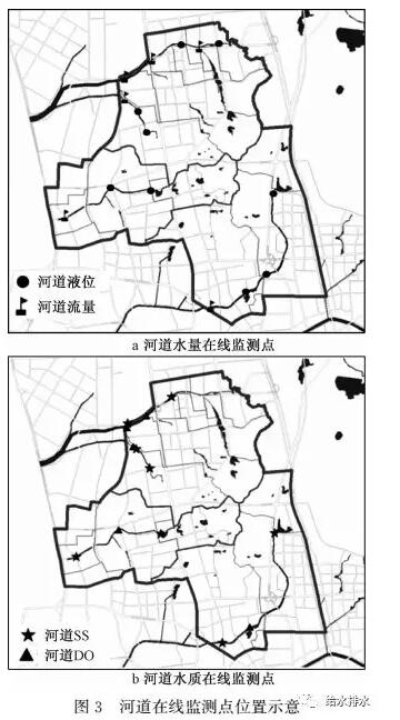 在水量監(jiān)測方面,各河道源頭均位于試點區(qū)內(nèi),在距源頭200m左右的位置進行液位在線監(jiān)測,沿途中間段布設液位計以監(jiān)測水位變化;試點區(qū)出口及支流匯入處布設流量監(jiān)測。水質監(jiān)測方面,為對流經(jīng)試點區(qū)部分進行水環(huán)境質量的綜合評價,在每條河道試點區(qū)范圍內(nèi)上下游各布置1臺在線SS監(jiān)測儀,河道中下游位置布設在線DO監(jiān)測儀,對河道整體的黑臭情況進行反映。河道在線監(jiān)測布點如圖3所示。