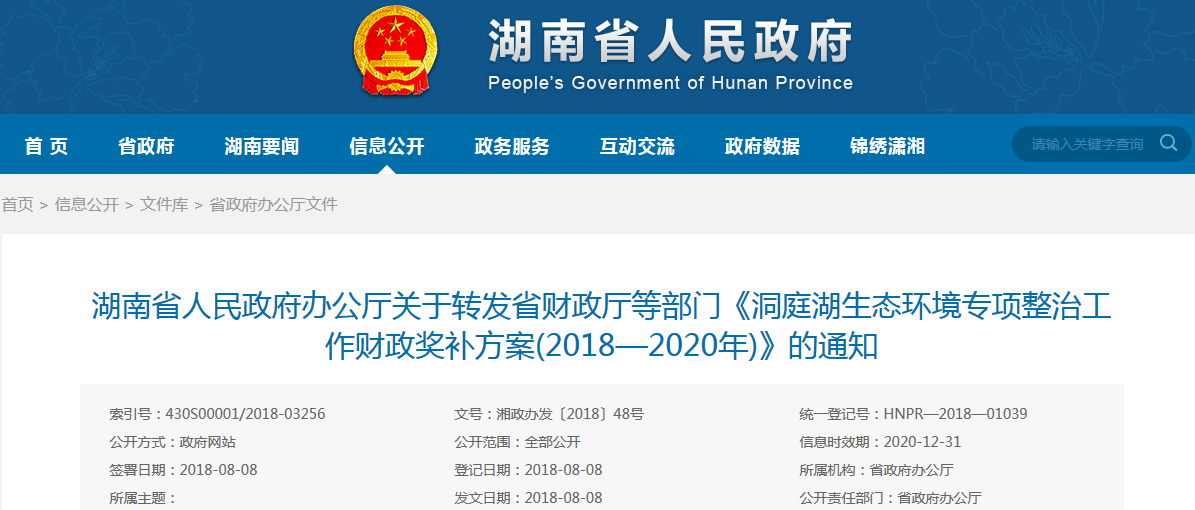 日前,湖南省人民政府辦公廳發(fā)布了關(guān)于轉(zhuǎn)發(fā)省財(cái)政廳等部門《洞庭湖生態(tài)環(huán)境專項(xiàng)整治工作財(cái)政獎(jiǎng)補(bǔ)方案(2018—2020年)》的通知,具體內(nèi)容如下: