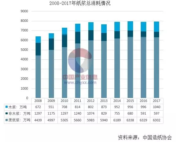 2017年全國紙漿消耗總量10051萬噸,較上年增長2.59%。木漿3152萬噸,占紙漿消耗總量31%,其中進(jìn)口木漿占21%、國產(chǎn)木漿占10%;廢紙漿6302萬噸,占紙漿消耗總量63%,其中用進(jìn)口廢紙制漿占21%、用國產(chǎn)廢紙制漿占42%;非木漿597萬噸,占紙漿消耗總量6%。