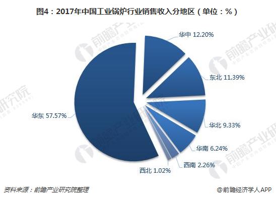不同的地區(qū)對工業(yè)鍋爐的用途大多不一樣,比如東北地區(qū),工業(yè)鍋爐多用于生產(chǎn)冬季采暖,而南方區(qū)域則主要應(yīng)用于工業(yè)生產(chǎn)動(dòng)力的供應(yīng)。整體而言,我國工業(yè)鍋爐行業(yè)在華東市場發(fā)展較好,占據(jù)著過半的市場份額。2017年,華東區(qū)域銷售收入占全國銷售收入的比重為57.57%;其次是華中地區(qū),占比為12.20%;東北和華北占比分別為11.39%、9.33%;華南、西南以及西北占比分別為6.24%、2.26%、1.02%。