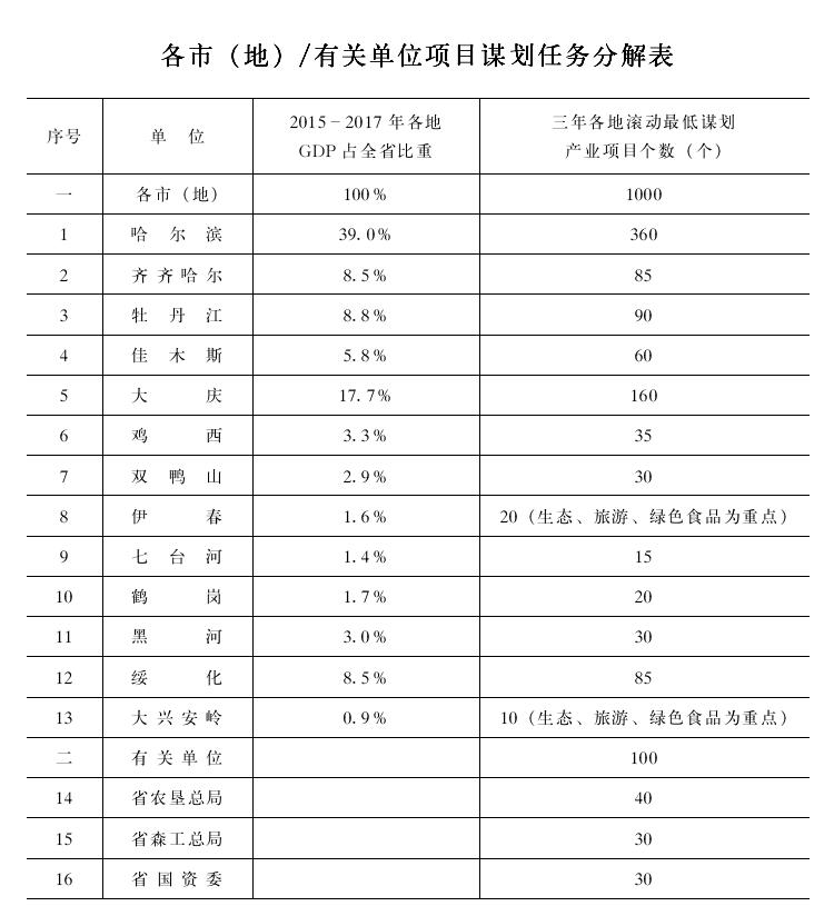 3.落實(shí)產(chǎn)業(yè)項(xiàng)目謀劃任務(wù)。堅(jiān)持產(chǎn)業(yè)項(xiàng)目謀劃與各地經(jīng)濟(jì)規(guī)模相匹配原則,哈爾濱、大慶、齊齊哈爾、牡丹江、佳木斯、綏化等主要城市在項(xiàng)目謀劃上要有更大擔(dān)當(dāng),更好的發(fā)揮省會(huì)城市示范作用、釋放中心城市帶動(dòng)作用,激活周邊區(qū)域要素,促進(jìn)區(qū)域協(xié)同發(fā)展。資源型地區(qū)要強(qiáng)化轉(zhuǎn)型發(fā)展,煤城突出現(xiàn)代煤化工和非煤替代產(chǎn)業(yè)項(xiàng)目謀劃工作,林區(qū)突出生態(tài)旅游、林下資源開發(fā)、綠色有機(jī)食品等項(xiàng)目儲(chǔ)備。沿邊地區(qū)要發(fā)揮地緣優(yōu)勢,突出開發(fā)外向型產(chǎn)業(yè)項(xiàng)目。按照各地2015年至2017年經(jīng)濟(jì)總量占全省的比重,并考慮各地間的適度均衡,確定各地三年謀劃產(chǎn)業(yè)項(xiàng)目最低目標(biāo),鼓勵(lì)各地超額完成任務(wù)。