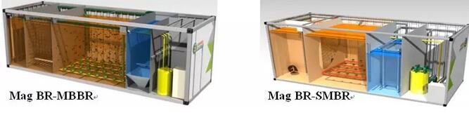MagBR磁介質(zhì)生物反應(yīng)器由環(huán)能科技股份有限公司自主研發(fā),是一套針對分散式污水的處理系統(tǒng),以傳統(tǒng)MBBR或MBR為基礎(chǔ),在好氧反應(yīng)單元添加磁性懸浮填料,強化生化反應(yīng)效果,在占地面積和運行成本均較低的情況下,有較好的污水處理效果。此外,采用基于RTU(遠(yuǎn)程終端單元)實現(xiàn)遠(yuǎn)程監(jiān)控和控制技術(shù),設(shè)備系統(tǒng)可無人值守,實現(xiàn)智慧云平臺服務(wù)。針對不同的處理效果需求,該系統(tǒng)分為MagBR-MBBR和MagBR-SMBR兩種系列。