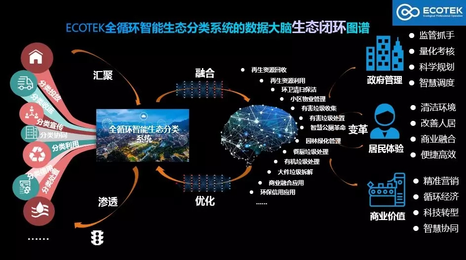 與此同時,行業(yè)技術從簡單的設備應用發(fā)展至如今的互聯(lián)網+深度推廣模式。智慧環(huán)衛(wèi)的服務主體逐步向大眾傾斜,因此,專注于全循環(huán)智能分類的生態(tài)系統(tǒng)(ECOTEK)應運而生。