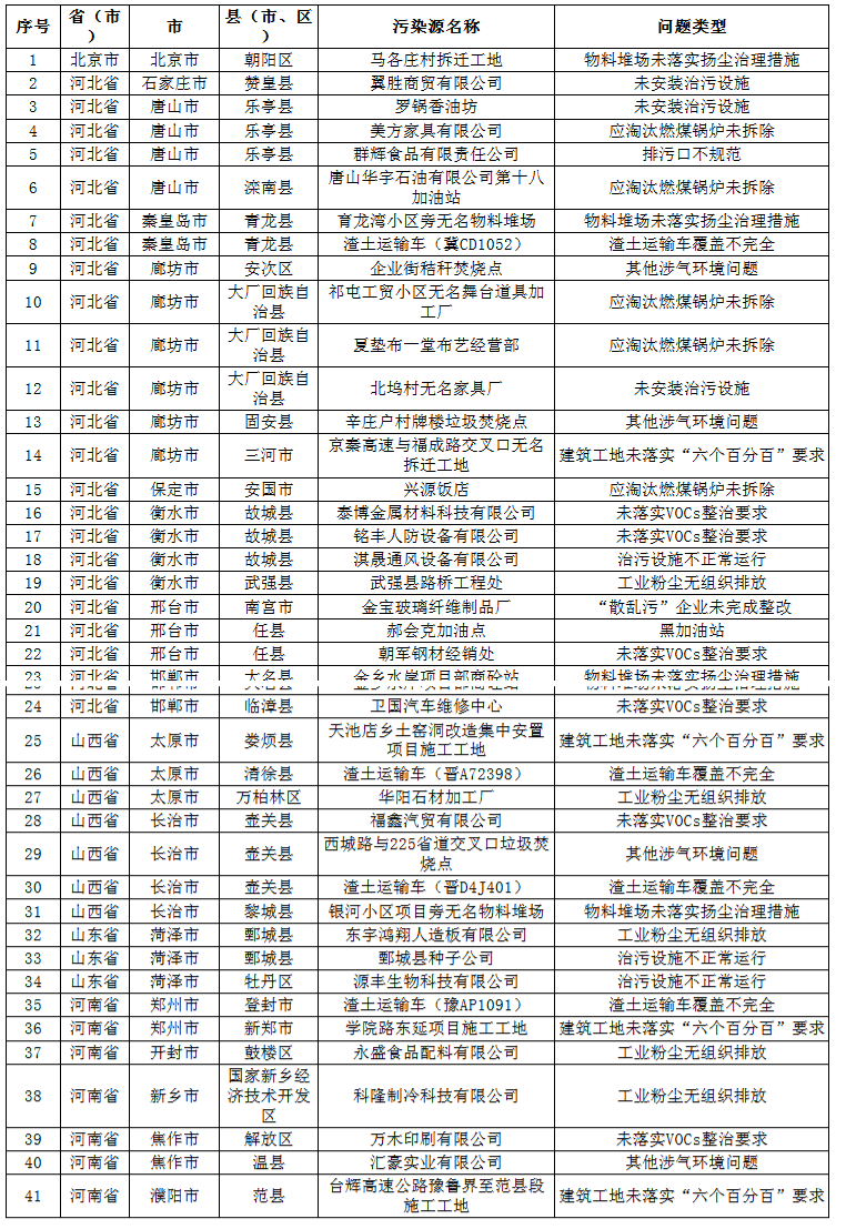 9月12日,2018-2019年藍(lán)天保衛(wèi)戰(zhàn)重點(diǎn)區(qū)域強(qiáng)化督查工作繼續(xù)開(kāi)展,其中200個(gè)督查組對(duì)京津冀及周邊地區(qū)的139個(gè)縣(市、區(qū))進(jìn)行督查、核查工作,發(fā)現(xiàn)涉氣環(huán)境問(wèn)題41個(gè)(見(jiàn)附件),核查點(diǎn)位1100個(gè),如下:
