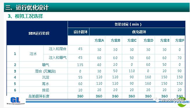 搭建上述污水處理廠工藝模型后,選擇平均流量和峰值流量在3種不同的溫度下構(gòu)成6套工藝方案。對原SBR設(shè)計(jì)循環(huán)進(jìn)行優(yōu)化,增加混合段時(shí)間,形成6種優(yōu)化循環(huán)方案。