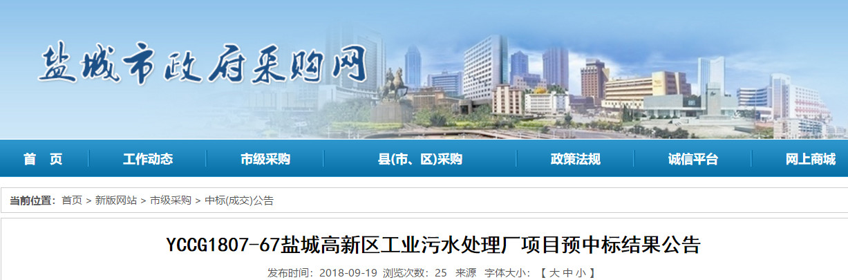 YCCG1807-67鹽城高新區(qū)工業(yè)污水處理廠項(xiàng)目預(yù)中標(biāo)結(jié)果公告