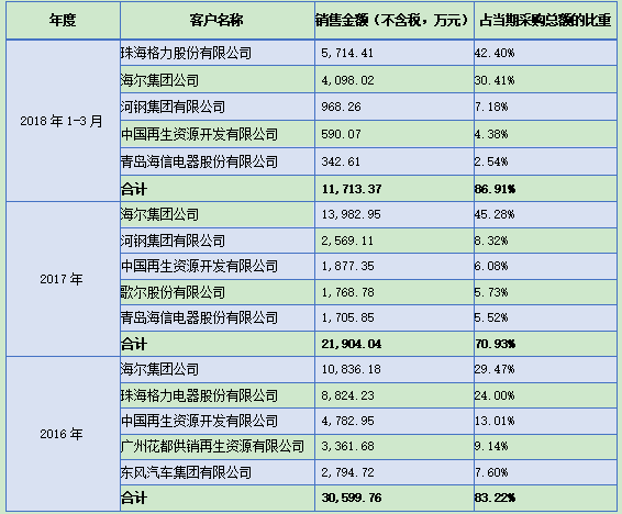 3、和大型知名企業(yè)的合作協(xié)議都簽到了2021年,穩(wěn)定性肯定沒問題:“中再環(huán)服與海爾集團(tuán)、格力電器、東風(fēng)汽車均維持多年合作關(guān)系,歌爾股份雖為2017年新增客戶,但雙方已簽訂了截至2021年的長(zhǎng)期合同,各大供應(yīng)商均對(duì)中再環(huán)服有較高的認(rèn)可度。因此,中再環(huán)服與上述大型企業(yè)建立的合作關(guān)系是可持續(xù)的。”