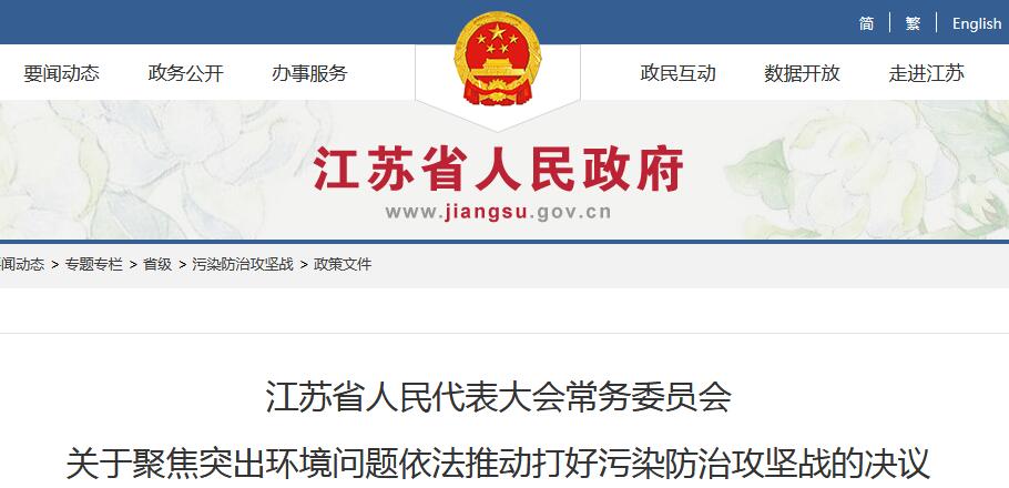 日前,江蘇省發(fā)布了《江蘇省人民代表大會(huì)常務(wù)委員會(huì)關(guān)于聚焦突出環(huán)境問(wèn)題依法推動(dòng)打好污染防治攻堅(jiān)戰(zhàn)的決議》,自公布之日起施行。詳情如下: