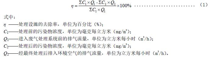 5.2.4 去除率可通過同時(shí)測定處理前后廢氣中污染物的排放濃度和排氣量,以被去除的污染物與處理之前的污染物的質(zhì)量百分比計(jì),計(jì)算方法見式(1)。