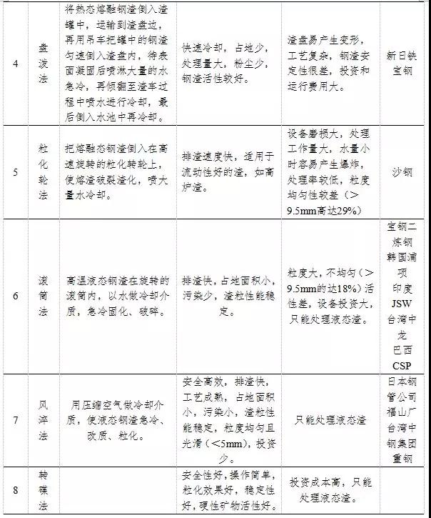 鋼渣的一次處理各種工藝均有利弊,選擇何種處理工藝需要從鋼渣的特性以及終端利用方式、對(duì)處理后粒度的要求、項(xiàng)目的節(jié)能環(huán)保要求、項(xiàng)目投資大小等方面綜合考慮。例如,如果鋼渣的流動(dòng)性差,則不能使用滾筒法、風(fēng)淬法、水淬法和?;喎ǎP潑法、熱潑法和熱悶法可以適用;如果從節(jié)能環(huán)保方面考慮,滾筒法和熱悶法較為適宜。