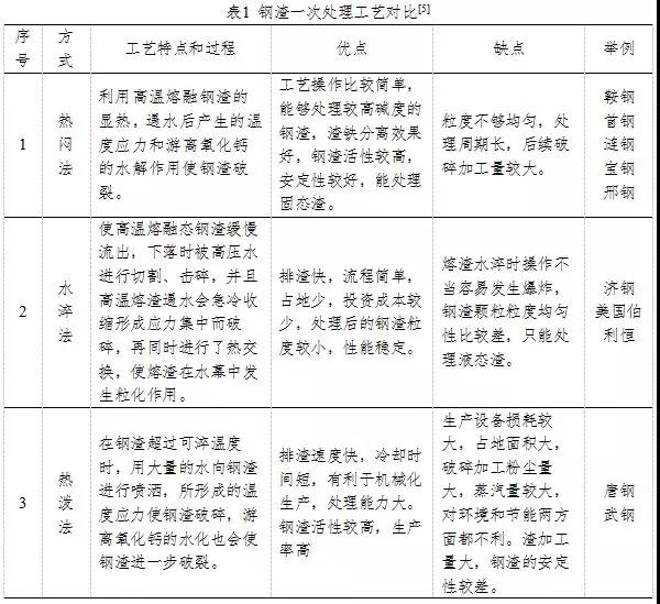 鋼渣的一次處理是把熱熔渣處理成粒徑符合一定要求的常溫塊渣,以有利于鋼渣的二次處理。目前國內(nèi)鋼渣一次處理主要工藝有:熱潑法、風(fēng)淬法、滾筒法、粒化輪法、熱悶法等,其中熱潑法、滾筒法、熱悶法最為常用。表1綜合比較了各種工藝的特點(diǎn)。