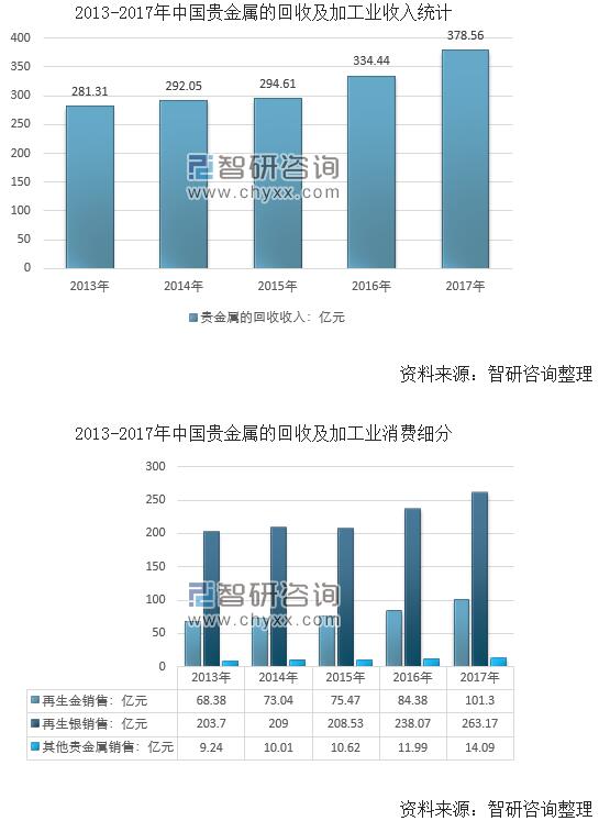 近兩年,在我國廢舊回收體系不斷完善的基礎(chǔ)上,我國貴金屬回收產(chǎn)業(yè)不斷發(fā)展,回收量和回收及加工企業(yè)的收入也在不斷的增長中,2016年我國再生金的產(chǎn)量達到了37.5噸,2017年增長至40.2噸,同時再生金占我國黃金總產(chǎn)量的比例不斷提升,中國黃金協(xié)會的統(tǒng)計數(shù)據(jù)顯示,2016年和2017年我國黃金產(chǎn)量總量分別為453.5噸和426.1噸,再生金產(chǎn)量占比分別為8.27%和9.43%,同時相關(guān)企業(yè)的再生金銷售收入也從84.38億元增長至101.30億元。而再生銀依然是我國回收量最大的貴金屬,2016年達到6265噸,2017年增長至6265噸,相應(yīng)的收入分別為238.07億元和263.17億元。