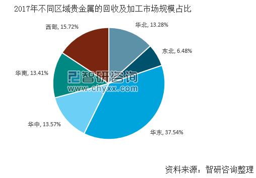 目前,國內(nèi)貴金屬的回收及加工需求市場主要集中在人口密集、經(jīng)濟發(fā)達的地區(qū)以及服務(wù)水平較高的各省一二線城市,存在一定的區(qū)域性特征。其中,華東地區(qū)市場需求最大,占全國比重達到37.54%。其次是華中、華南和華北地區(qū),總的來看,這幾個地區(qū)基礎(chǔ)工業(yè)發(fā)展較為完善,含廢舊貴金屬的產(chǎn)品消費量大,廢舊貴金屬產(chǎn)業(yè)具有較大的想象空間。但是從整個產(chǎn)業(yè)的發(fā)展完善的程度來看,北京地區(qū)已經(jīng)基本形成了完善的回收加工體系,上海地區(qū)的緊隨其后,華東和華南的部分區(qū)域依然以小作坊為主,產(chǎn)業(yè)發(fā)展環(huán)境急需規(guī)范。