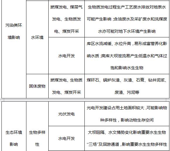 4、生態(tài)環(huán)境影響:煤礦開采造成采空塌陷區(qū),導(dǎo)致土壤龜裂,山體滑坡,水資源流失,耕地毀壞;光電開發(fā)占用土地面積較大,影響動物生存空間,對物種多樣性有一定影響;水電開發(fā)造成水文情勢變化,影響水生生物“三場”及洄游通道,影響水生生物多樣性;風(fēng)電開發(fā)風(fēng)機(jī)可能對鳥類的覓食、休憩和遷飛等活動行為產(chǎn)生一定的不利影響。