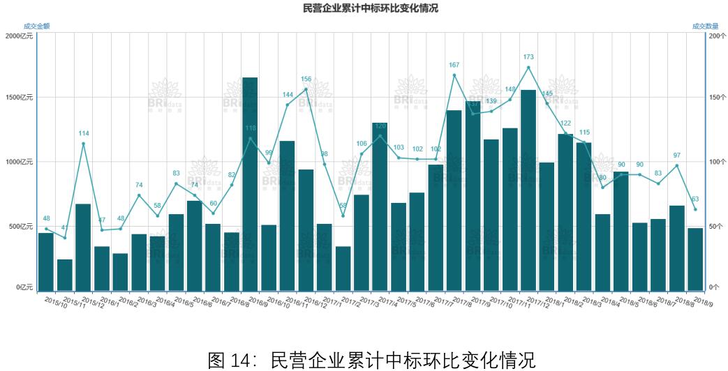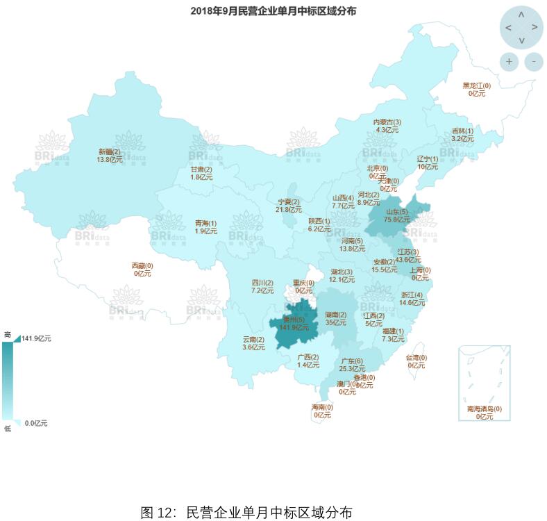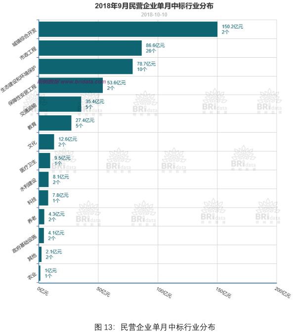 本月民營(yíng)企業(yè)作為單獨(dú)投標(biāo)方或聯(lián)合體牽頭方共中標(biāo) 63 個(gè)項(xiàng)目,合計(jì) 481.41 億元,本月民企中標(biāo)項(xiàng)目個(gè)數(shù)及項(xiàng)目規(guī)模均較上月有所下降。其中民營(yíng)企業(yè)中標(biāo)區(qū)域、行業(yè)分布如下圖所示: