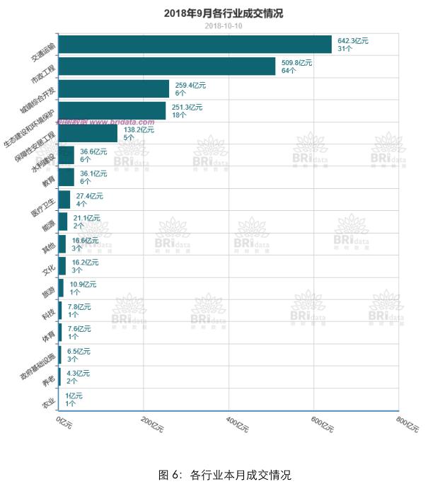 從區(qū)域成交的情況來(lái)看,本月四川省、浙江省和貴州省成交的項(xiàng)目金額排名前列,分別成交了 325.1 億元、229.8 億元、210.4 億元。截止至 2018 年 9 月底,河南省落地項(xiàng)目總規(guī)模超過(guò)了云南省位列第一,河南省、云南省和四川省占據(jù)了累計(jì)實(shí)施 PPP項(xiàng)目金額的前三位。
