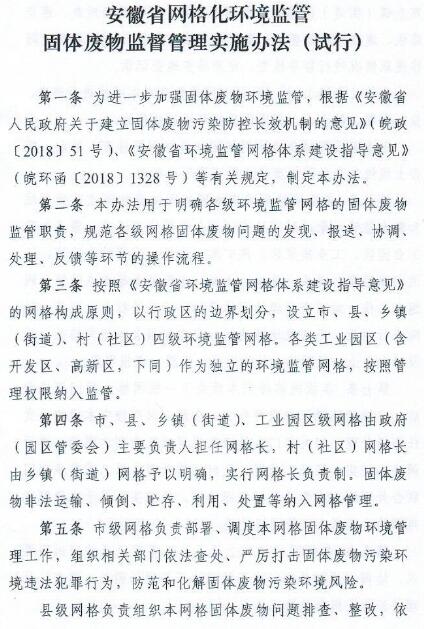 日前,安徽環(huán)保廳公布《安徽省網(wǎng)格化環(huán)境監(jiān)管固體廢物監(jiān)督管理實施辦法》,詳情如下: