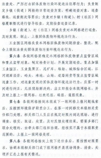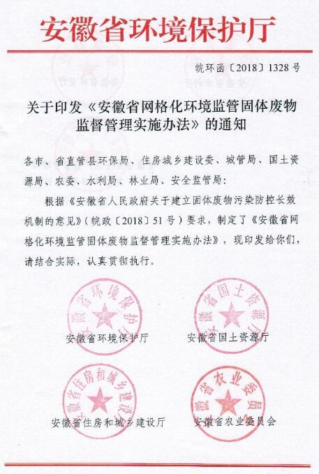 根據(jù)《安徽省人民政府關于建立固體廢物污染防控長效機制的意見》(皖政〔2018〕51號)要求,制定了《安徽省網(wǎng)格化環(huán)境監(jiān)管固體廢物監(jiān)督管理實施辦法》,現(xiàn)印發(fā)給你們,請結(jié)合實際,認真貫徹執(zhí)行。
