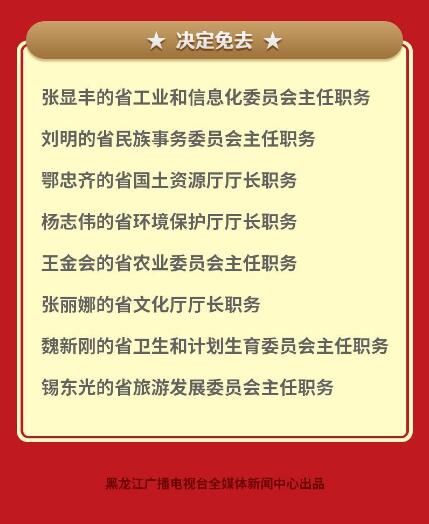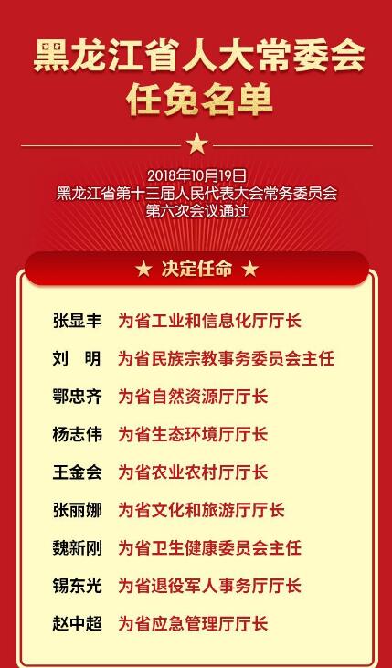 2018年10月19日,黑龍江省第十三屆人民代表大會(huì)常務(wù)委員會(huì)第六次會(huì)議通過黑龍江省人大常委會(huì)任免名單。