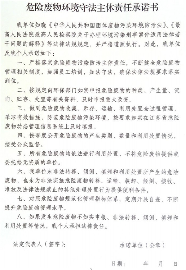 按照江蘇省環(huán)保廳的要求,每個(gè)危險(xiǎn)廢物產(chǎn)生單位和經(jīng)營單位都要簽署“危險(xiǎn)廢物環(huán)境守法主體責(zé)任承諾書”,一式二份,一份交屬地環(huán)保局,一份自留。