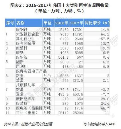 截至2017年底,我國(guó)廢鋼鐵、廢有色金屬、廢塑料、廢輪胎、廢紙、廢棄電器電子產(chǎn)品、報(bào)廢機(jī)動(dòng)車、廢舊紡織品、廢玻璃、廢電池十大類別的再生資源回收總量為2.82億噸,同比增長(zhǎng)11%。其中,廢電池、廢玻璃、廢舊紡織品回收量增幅較為明顯,分別增長(zhǎng)46.7%、24.4%和29.6%;廢塑料和報(bào)廢機(jī)動(dòng)車回收量出現(xiàn)下滑,分別同比減少9.9%和7.7%。