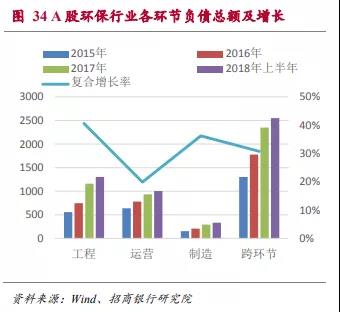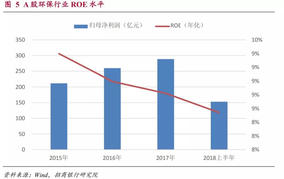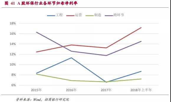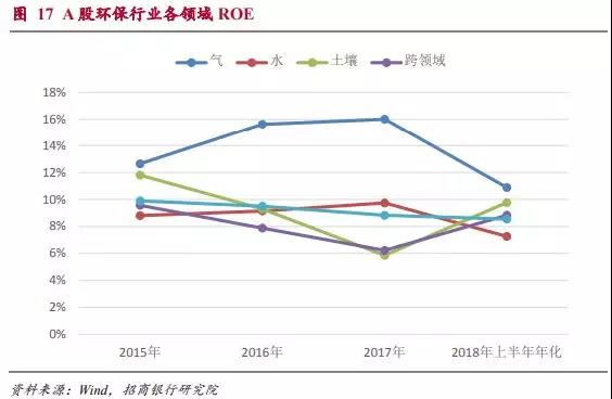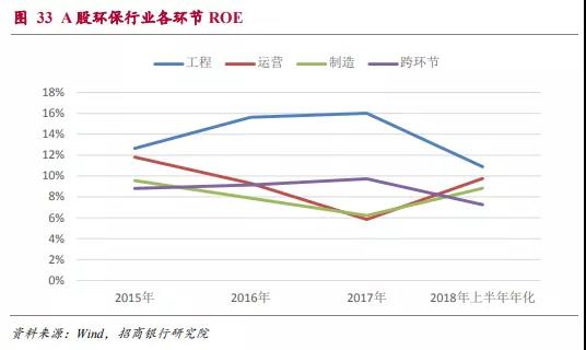 2015年到2017年環(huán)保類上市公司的ROE分別為9.4%、9.0%和8.3%,有逐年下降的趨勢(shì)(由于環(huán)保工程類項(xiàng)目大多數(shù)結(jié)算集中于下半年,2018年上半年年化以后的ROE水平明顯略低屬于正常情況)。在后文的分析中可以看出行業(yè)ROE水平的下降主要是受到運(yùn)營(yíng)和制造環(huán)節(jié)ROE下滑的影響。2018年上半年這兩個(gè)領(lǐng)域的ROE水平已經(jīng)開始回升,因此整體行業(yè)ROE下滑的趨勢(shì)可能會(huì)改變。