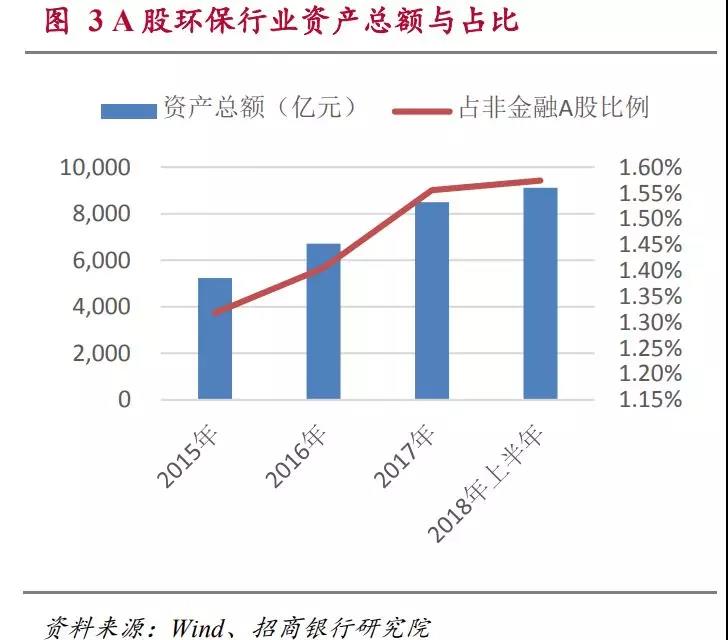 上市公司中,環(huán)保行業(yè)資產(chǎn)呈現(xiàn)逐步增長(zhǎng)的趨勢(shì)。從2015年底到2018年上半年,環(huán)保行業(yè)A股上市公司的資產(chǎn)總額從5231億增加到9124億,年復(fù)合增長(zhǎng)率為24.9%,快于A股總體資產(chǎn)的增長(zhǎng)。本行業(yè)資產(chǎn)占A股總資產(chǎn)的比重從2015年年底的1.32%,上升到2018年的年中的1.57%。