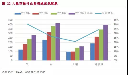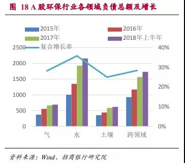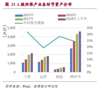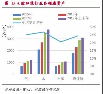 在各領(lǐng)域的資產(chǎn)中,水體環(huán)保的資產(chǎn)在A股環(huán)保行業(yè)資產(chǎn)中占比最高,2018年上半年占到了41.44%。同時(shí)這一領(lǐng)域增速也是最快的,達(dá)到26.76%。由于水體環(huán)保在未來的3-5年內(nèi)還將是我國(guó)環(huán)保治理的重點(diǎn)領(lǐng)域。我們預(yù)計(jì)這種趨勢(shì)還將持續(xù)一段時(shí)間。另外,隨著非電工業(yè)“超低排放”標(biāo)準(zhǔn)的推行,未來大氣環(huán)保在全領(lǐng)域中的資產(chǎn)占比或也將有所提升。