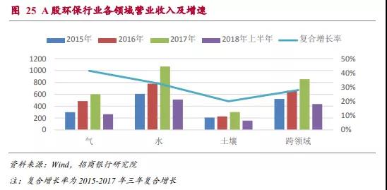 過去三年里,大氣環(huán)保和水體環(huán)保是增速較高的兩個(gè)領(lǐng)域,收入的年復(fù)合增速分別達(dá)到了41.44%和32.47%。這也與這兩年環(huán)保領(lǐng)域重點(diǎn)擴(kuò)張的領(lǐng)域保持一致。而土壤環(huán)保和跨領(lǐng)域上市公司的收入增長(zhǎng)幅度分別低于20%和30%。