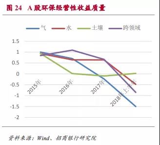 導(dǎo)致自由現(xiàn)金流缺口較大的原因,除了行業(yè)高速擴(kuò)張,投資金額大幅度擴(kuò)大以外,經(jīng)營(yíng)利潤(rùn)質(zhì)量的下滑也是重要因素之一。我們用經(jīng)營(yíng)性現(xiàn)金流/(營(yíng)業(yè)利潤(rùn)-投資收益)這一比例來反映上市公司經(jīng)營(yíng)性收益質(zhì)量。圖24顯示三個(gè)領(lǐng)域這一指標(biāo)都出現(xiàn)下滑,說明環(huán)保行業(yè)的收益質(zhì)量在這三年里出現(xiàn)下降。