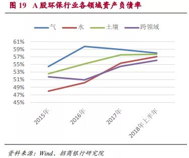圖18顯示過去的3年里,在A股環(huán)保行業(yè)的各領(lǐng)域中,水體環(huán)保的負(fù)債上升速度最快,增速達(dá)到了30%以上。同時(shí)水體環(huán)保也因此從資產(chǎn)負(fù)債率最低的領(lǐng)域快速上升至與平均水平接近。目前4個(gè)領(lǐng)域的資產(chǎn)負(fù)債率有趨于一致的趨勢(shì),都略低于60%。