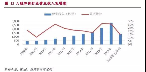 十年來,A股環(huán)保上市公司的營(yíng)業(yè)收入經(jīng)歷了兩輪快速成長(zhǎng)期,分別是09-11年和15-17年。這兩輪營(yíng)收的高增長(zhǎng)分別對(duì)應(yīng)了大氣治理和污水處理的高投入期。由于污水處理的投資額可能遠(yuǎn)遠(yuǎn)高于大氣治理,時(shí)間跨度也會(huì)較長(zhǎng),所以我們判斷這一輪環(huán)保行業(yè)的高增長(zhǎng)期可能會(huì)持續(xù)較長(zhǎng)的時(shí)間。