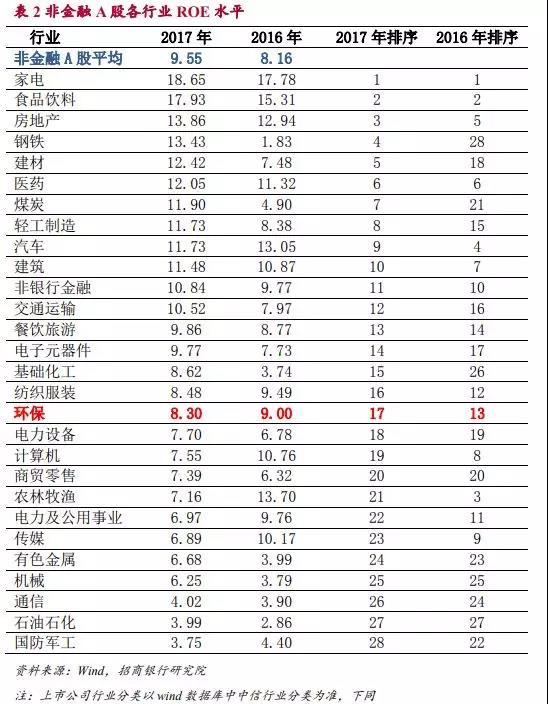 與A股其他行業(yè)相比較來看,環(huán)保行業(yè)ROE處于中游水平。2016年環(huán)保行業(yè)ROE為9.0%,處于28個(gè)行業(yè)中的第13位,明顯高于非金融A股的平均水平。而2017年環(huán)保行業(yè)ROE有所下滑,而周期行業(yè)的利潤(rùn)出現(xiàn)了明顯的回升,使環(huán)保行業(yè)的ROE水平明顯低于非金融類A股的平均投資回報(bào)率,排序也下降到第17位。