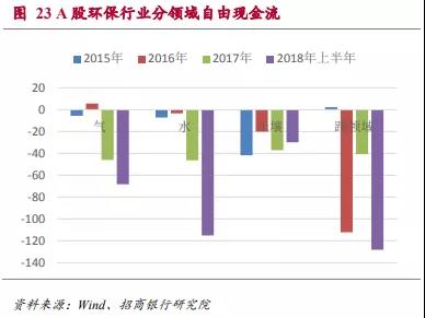 圖23顯示大氣環(huán)保和水體環(huán)保領(lǐng)域的自由現(xiàn)金流從2017年起出現(xiàn)大量缺口,而跨領(lǐng)域自由現(xiàn)金流缺口最大,同時(shí)波動(dòng)幅度也較大。這三個(gè)領(lǐng)域經(jīng)營(yíng)性現(xiàn)金流都不能滿足行業(yè)快速擴(kuò)張的需求。土壤環(huán)保相對(duì)缺口較小,這很有可能是土壤環(huán)保目前還處于探索階段,大規(guī)模投資還未啟動(dòng)導(dǎo)致的。