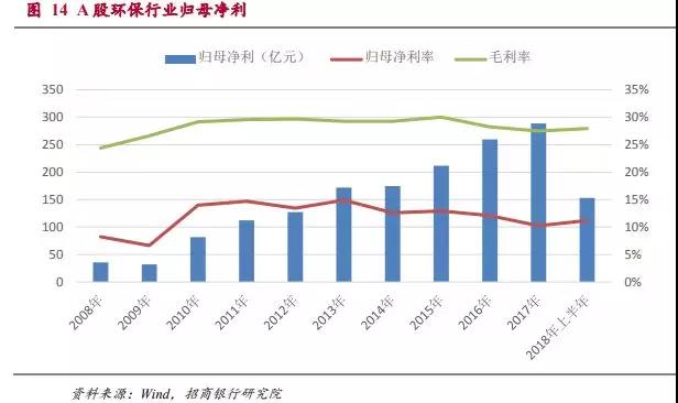在收入高增長(zhǎng)的同時(shí),行業(yè)的盈利能力有所回落。環(huán)保行業(yè)A股上市公司整體的歸母凈利率從2013年起逐步由15%左右的水平下降至10%出頭,但毛利率的下滑是從2015年才開始的,所以這一下滑可能是毛利率下滑和費(fèi)用率提高的共同作用。這一指標(biāo)在2018年上半年開始企穩(wěn)回升。