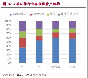 從各領(lǐng)域資產(chǎn)分布的情況來看,大氣領(lǐng)域的非流動(dòng)資產(chǎn)占比最低,同時(shí)應(yīng)收賬款的比例明顯偏高。這與大氣環(huán)保領(lǐng)域上市公司多數(shù)以工程和制造為主、運(yùn)營(yíng)偏少的業(yè)務(wù)模式有關(guān)。