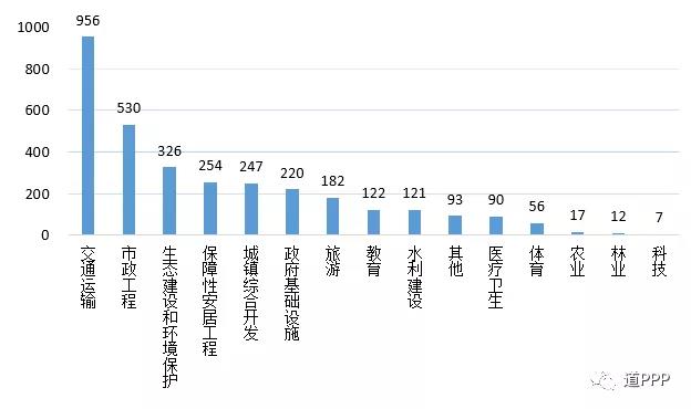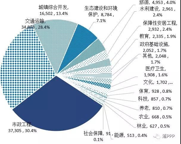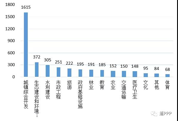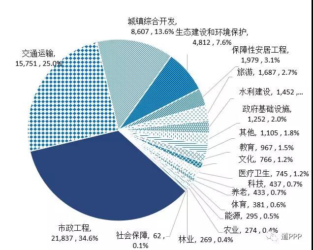 管理庫累計(jì)落地項(xiàng)目數(shù)前三位是市政工程、交通運(yùn)輸、生態(tài)建設(shè)和環(huán)境保護(hù),分別是1,651個(gè)、564個(gè)和410個(gè),合計(jì)占落地項(xiàng)目總數(shù)的64.2%。累計(jì)落地項(xiàng)目投資額前三位為市政工程、交通運(yùn)輸、城鎮(zhèn)綜合開發(fā),分別為21,837億元、15,751億元和8,607億元,合計(jì)占落地項(xiàng)目總投資額的73.2%,如圖1-5-8和1-5-9。