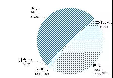 社會(huì)資本合作方類型。4,089個(gè)落地項(xiàng)目中社會(huì)資本所有制信息完善的項(xiàng)目共4,018個(gè),涉及社會(huì)資本共6,753家,包括民營2,383家、港澳臺(tái)134家、外商33家、國有3,443家,另有類型不易辨別的其他760家,民營企業(yè)占比35.3%,如圖1-6-1。