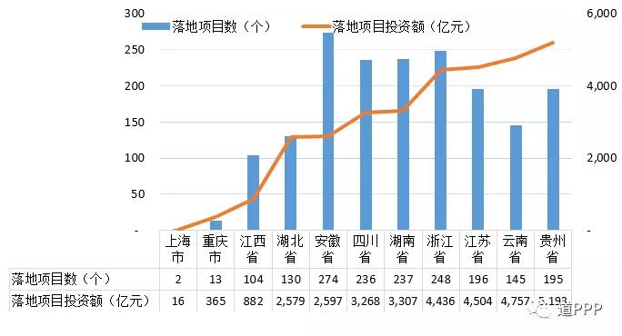 管理庫累計(jì)長江經(jīng)濟(jì)帶落地項(xiàng)目總數(shù)1,780個(gè)、投資額31,902億元,分別占管理庫的43.5%和50.5%。落地項(xiàng)目數(shù)前三位是安徽274個(gè)、浙江248個(gè)、湖南237個(gè);落地項(xiàng)目投資額前三位是貴州5,193億元、云南4,757億元、江蘇4,504億元,具體見圖1-9-2。