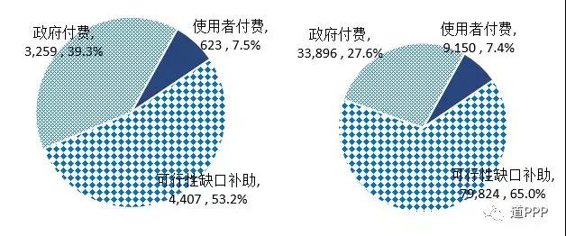 管理庫累計(jì)使用者付費(fèi)類項(xiàng)目623個(gè)、投資額9,150億元,分別占管理庫的7.5%和7.4%;累計(jì)可行性缺口補(bǔ)助(即政府市場混合付費(fèi))類項(xiàng)目4,407個(gè)、投資額8.0萬億元,分別占管理庫的53.2%和65.0%;累計(jì)政府付費(fèi)類項(xiàng)目3,259個(gè)、投資額3.4萬億元,分別占管理庫的39.3%和27.6%,具體如圖1-11-3和1-11-4。