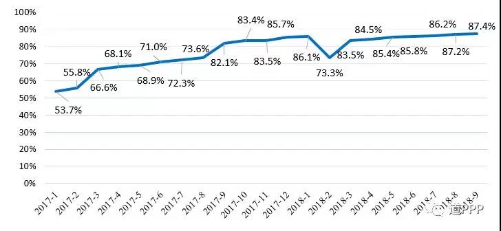三季度落地示范項(xiàng)目凈減項(xiàng)目1個(gè)、投資額946億元,項(xiàng)目數(shù)、投資額下滑緣于落地示范項(xiàng)目退庫。截至2018年三季度,落地示范項(xiàng)目累計(jì)865個(gè)、投資額1.9萬億元,落地率87.4%,無移交階段項(xiàng)目。示范項(xiàng)目總體落地率變化如圖2-2-1。