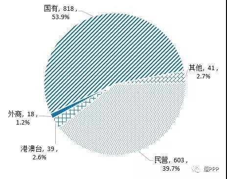 社會(huì)資本合作方類型。865個(gè)落地示范項(xiàng)目中包括446個(gè)獨(dú)家社會(huì)資本項(xiàng)目和419個(gè)聯(lián)合體項(xiàng)目。簽約社會(huì)資本共1,519家,包括民營603家、港澳臺(tái)39家、外商18家、國有818家,另有類型不易辨別的其他41家。如圖2-5-1,民營企業(yè)占比39.7%,環(huán)比上升0.3個(gè)百分點(diǎn)。