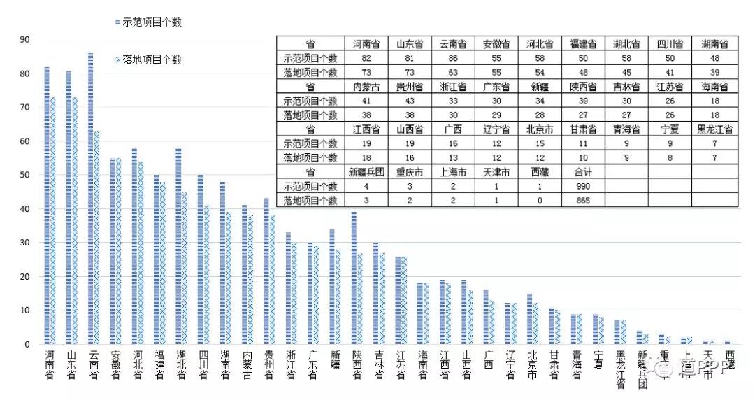 按各地落地示范項(xiàng)目數(shù)統(tǒng)計(jì),河南和山東(含青島)已有73個(gè)示范項(xiàng)目簽約進(jìn)入執(zhí)行階段,并列居全國第一;其后云南63個(gè)、安徽55個(gè)、河北54個(gè)。其余各省均不足50個(gè)。各地示范項(xiàng)目數(shù)與落地?cái)?shù)對(duì)比如圖2-4。